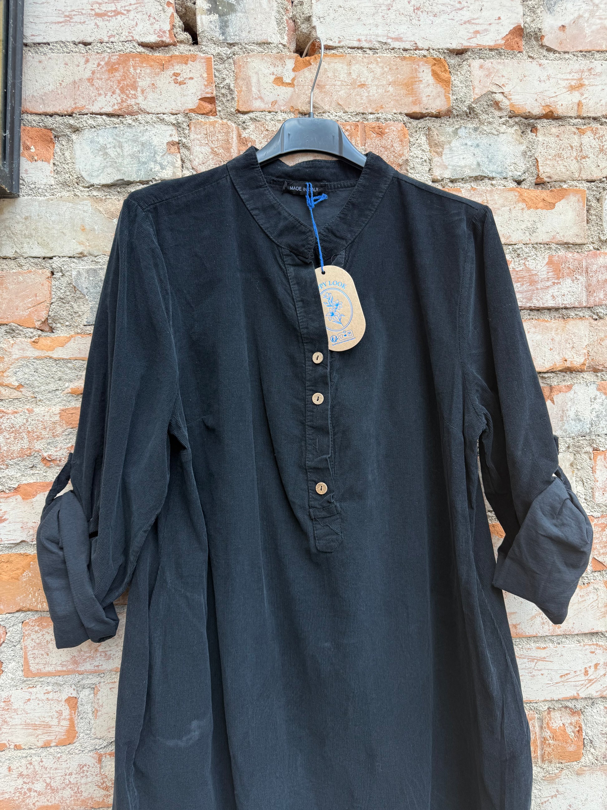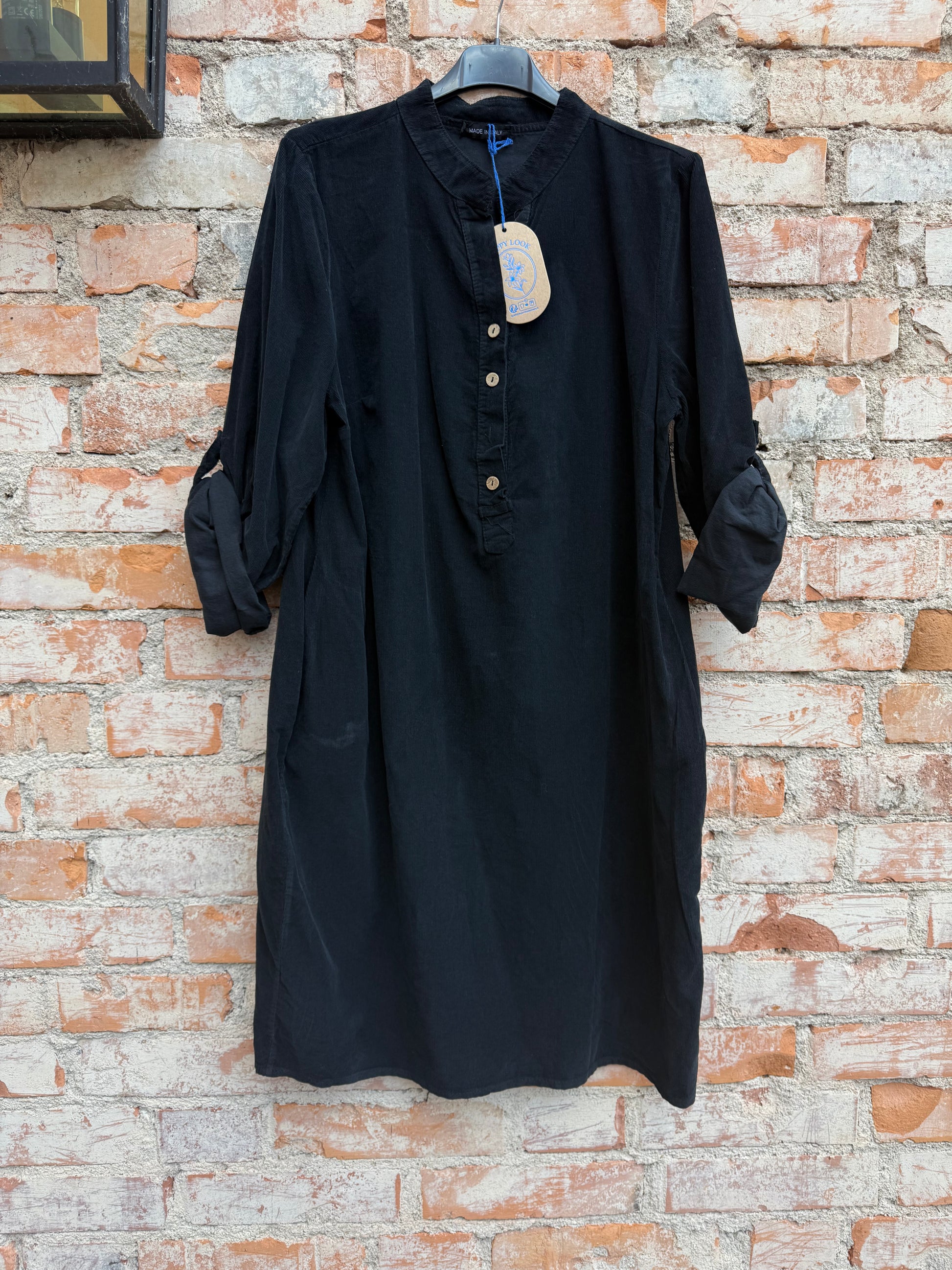 Väldigt fin klänning i manchester i lätt a-form. Sotarkrage med knäppning och fickor.