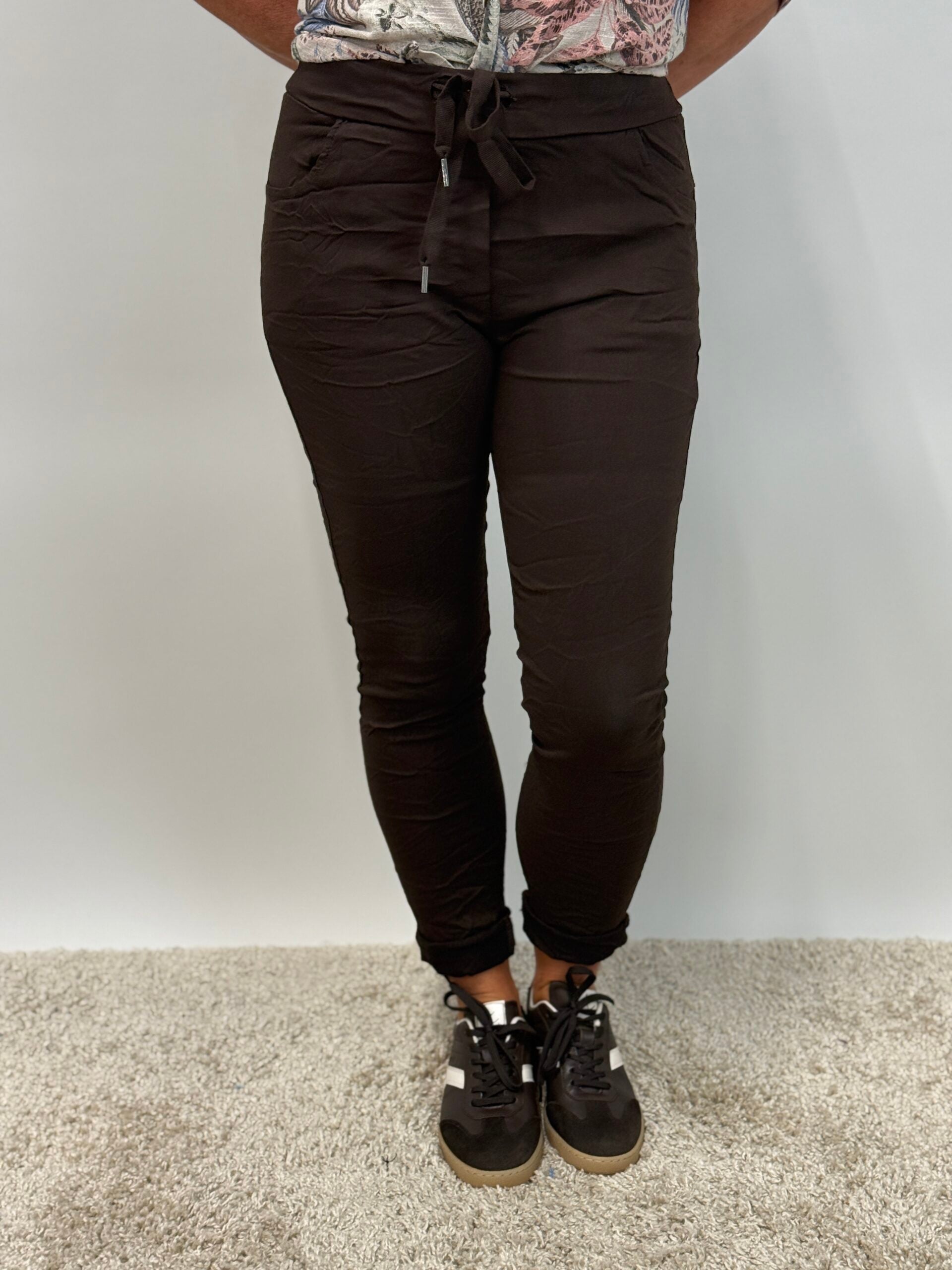 Magiskt stretchiga byxor med resår i midjan och fickor fram och bak.